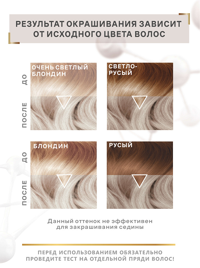 Холодный блонд с ярко выраженным серебристо-пепельным оттенком, создающим эффект чистого «ледяного» цвета. Усиленный инновационной системой «умного цвета» Color IQ и ухаживающими компонентами, оттенок сохраняет стойкость до 9 недель и придаёт волосам еще больше гладкости и блеска.