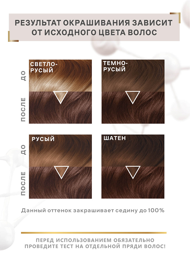 Благородный тёмно-коричневый оттенок с тёплыми нотами горького шоколада. Подходит для тёплого цветотипа, подчёркивает тон кожи без резкого контраста. Усиленный инновационной системой «умного цвета» Color IQ и ухаживающими компонентами, оттенок сохраняет стойкость до 9 недель и придаёт волосам еще больше гладкости и блеска.