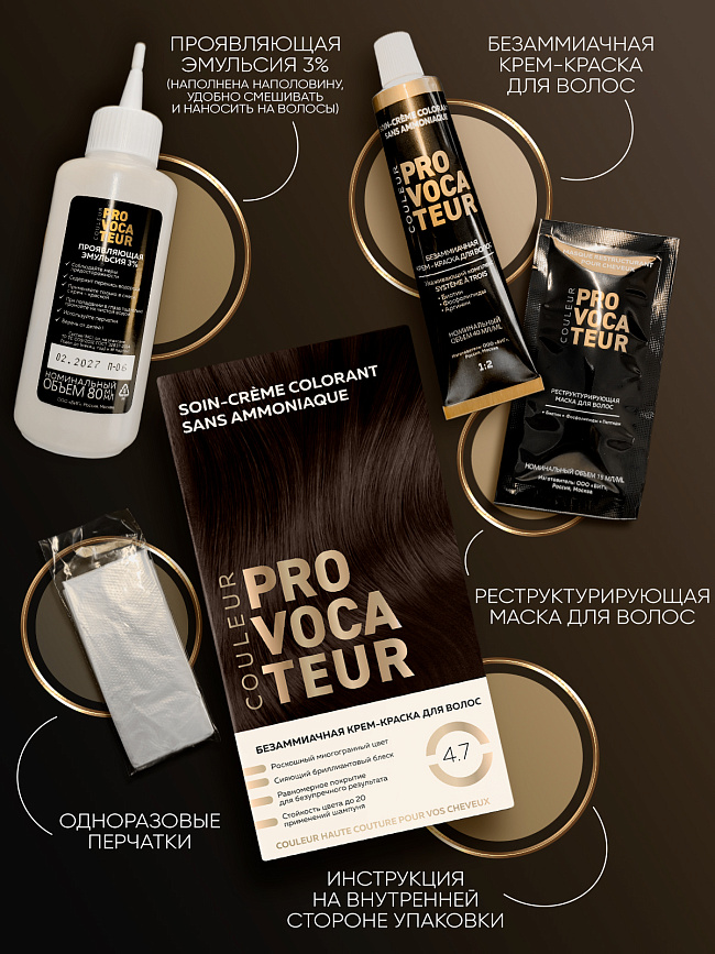 Обязательно проведите тест на аллергическую реакцию за 48 часов до окрашивания. При первом применении краски на длинные волосы рекомендуется использовать 2 набора для безаммиачного окрашивания Provocateur.
