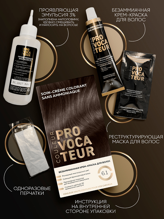 Обязательно проведите тест на аллергическую реакцию за 48 часов до окрашивания. При первом применении краски на длинные волосы рекомендуется использовать 2 набора для безаммиачного окрашивания Provocateur.