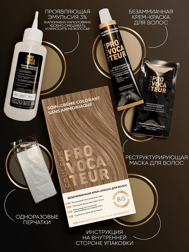 Обязательно проведите тест на аллергическую реакцию за 48 часов до окрашивания. При первом применении краски на длинные волосы рекомендуется использовать 2 набора для безаммиачного окрашивания Provocateur.