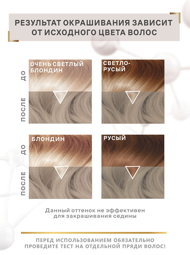 Холодный блонд с ярко выраженным пепельным подтоном, создающий чистый и элегантно сдержанный образ. Усиленный инновационной системой «умного цвета» Color IQ и ухаживающими компонентами, оттенок сохраняет стойкость до 9 недель и придаёт волосам еще больше гладкости и блеска.