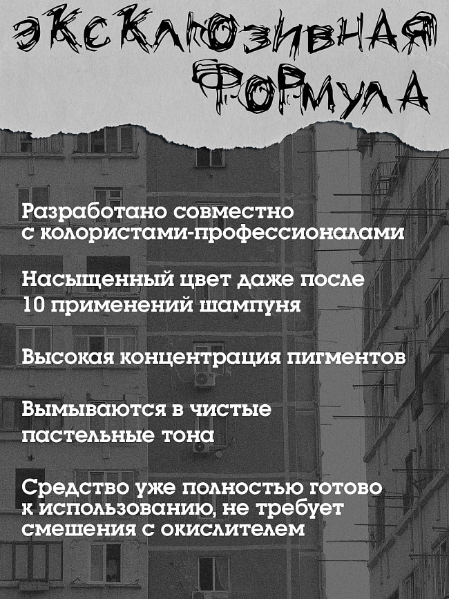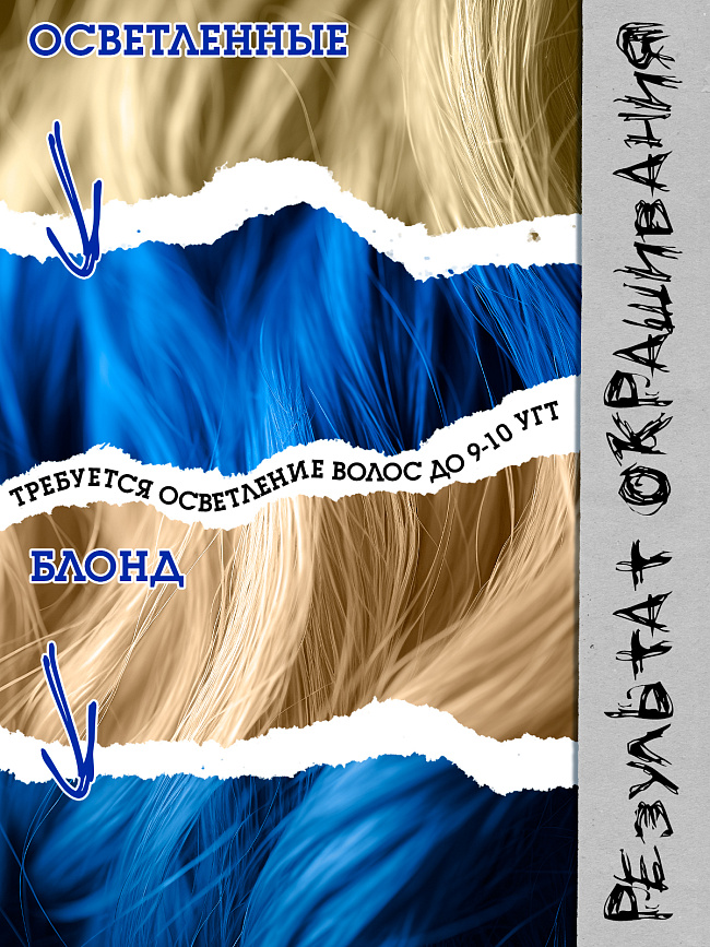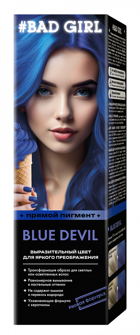 BAD GIRL Blue Devil – для тех, кто давно понял: дьявол кроется в деталях. Насыщенный пленительный оттенок, от которого просто невозможно оторваться. Впрочем, тебе это только на руку – достаточно лишь грамотно обыграть свой образ. Не требует смешивания. Средство полностью готово к нанесению. Никаких повреждений. Не содержит аммиак и перекись водорода. Прямой пигмент. Для получения максимальной ярких оттенков. Максимальный результат от применения ты получишь на светлых, очень светлых или предварительно осветленных до 9-10 УГТ волосах.