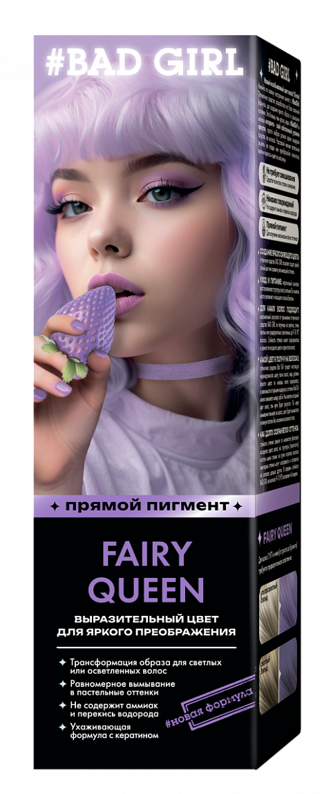 BAD GIRL Fairy Queen – для тех, кто открыт переменам и всему новому. Притягательный, сказочный оттенок, который подчеркивает твою уникальность. Кстати, позволь задать следующий вопрос: ты уже привыкла, что комплименты сопровождают тебя на каждом шагу? Не требует смешивания. Средство полностью готово к нанесению. Никаких повреждений. Не содержит аммиак и перекись водорода. Прямой пигмент. Для получения максимальной ярких оттенков. Максимальный результат от применения ты получишь на светлых, очень светлых или предварительно осветленных до 9-10 УГТ волосах.