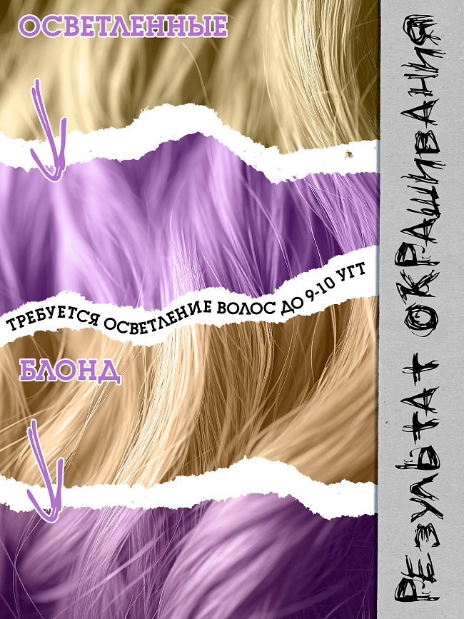 Для волос 7 УГТ и ниже (от русого до брюнета) требуется предварительное осветление. Максимальный результат от применения оттеночного средства Bad Girl ты получишь на светлых, очень светлых или предварительно осветленных до 9-10 УГТ волосах.