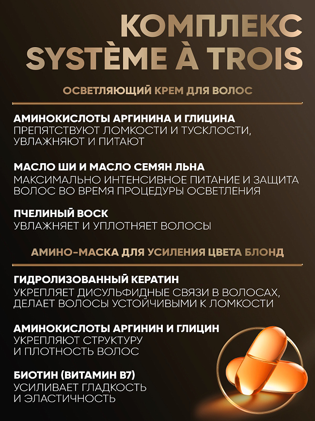 Инновационный и максимально БЕРЕЖНЫЙ подход к процедуре домашнего осветления, салонный результат у вас дома.Полный сет для домашнего применения- для роскошного блонда, наполненного сиянием!