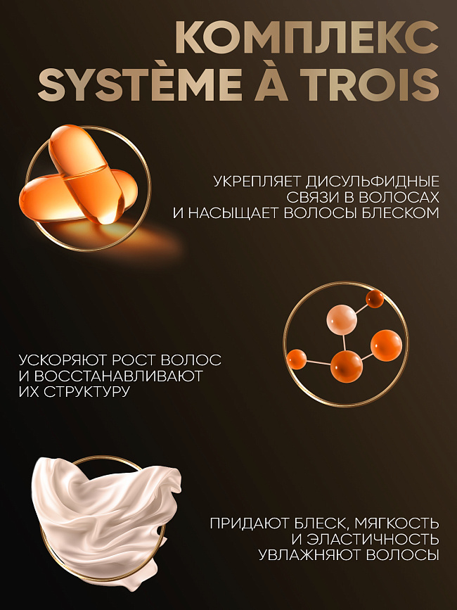 Инновационный ухаживающий комплекс Système à trois содержит АМИНОКИСЛОТЫ АРГИНИНА И ГЛИЦИНА, ГИДРОЛИЗОВАННЫЙ КЕРАТИН И ПРОТЕИНЫ ШЕЛКА. Аминокислоты укрепляют кровоснабжение волосяных фолликулов (луковиц), ускоряют рост волос и восстанавливают их структуру. Гидролизованный кератин укрепляет дисульфидные связи в волосах, связываясь с аминокислотами, делает волосы более устойчивыми к ломкости и более крепкими к внешним воздействиям. Протеины шелка интенсивно увлажняют, снимают статику, придают волосам мягкость и эластичность, делая их гладкими, блестящими и послушными.