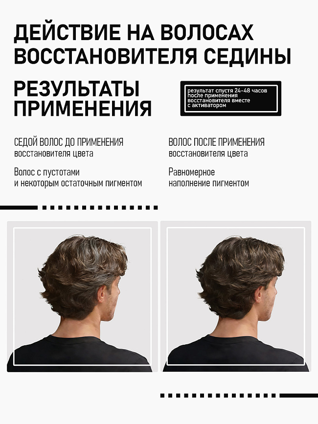 - Естественное восстановление цвета: постепенно возвращает седым волосам их природный оттенок, без эффекта "краски". Исчезает резкий контраст между длиной и корнями.