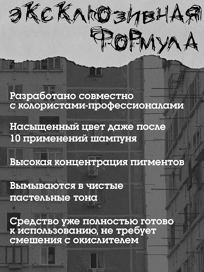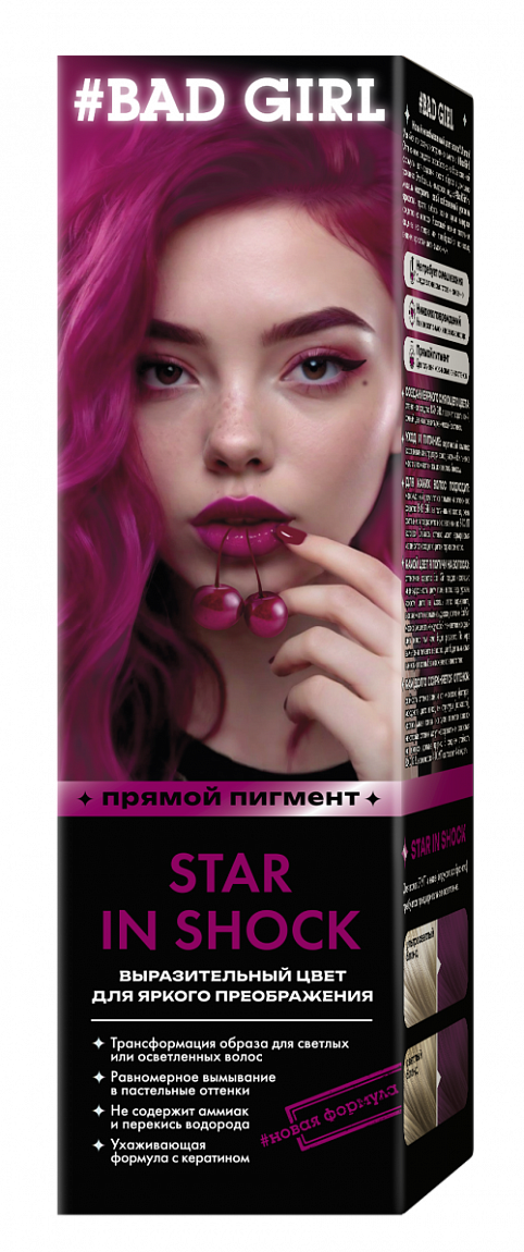 BAD GIRL Star In Shock – для тех, кто прекрасно знает себе цену. Яркий и сочный оттенок просто создан, чтобы ты блистала. Взгляды в твою сторону обеспечены, поэтому время наслаждаться всеобщим вниманием. Не требует смешивания. Средство полностью готово к нанесению. Никаких повреждений. Не содержит аммиак и перекись водорода. Прямой пигмент. Для получения максимальной ярких оттенков. Максимальный результат от применения ты получишь на светлых, очень светлых или предварительно осветленных до 9-10 УГТ волосах.
