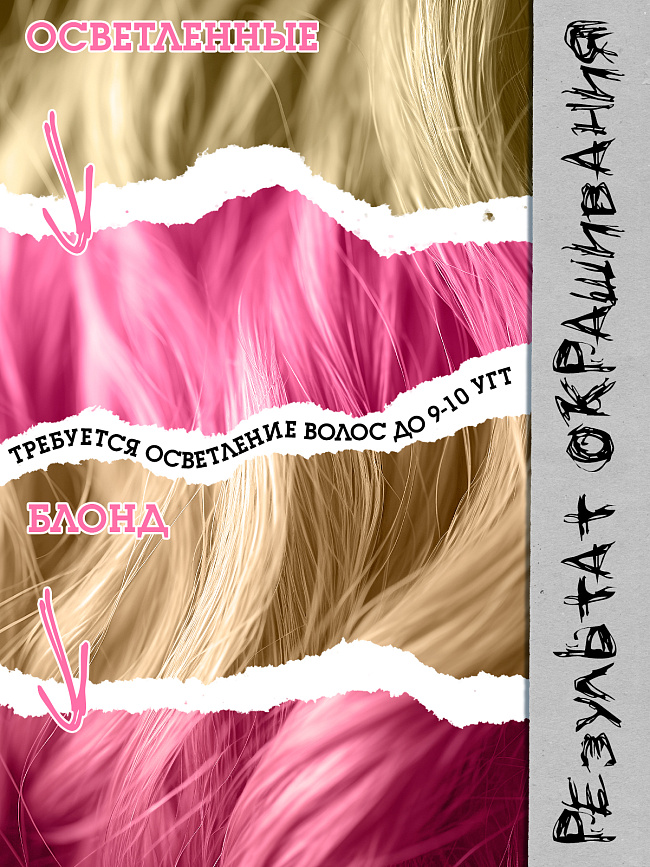 Для волос 7 УГТ и ниже (от русого до брюнета) требуется предварительное осветление. Максимальный результат от применения оттеночного средства Bad Girl ты получишь на светлых, очень светлых или предварительно осветленных до 9-10 УГТ волосах.